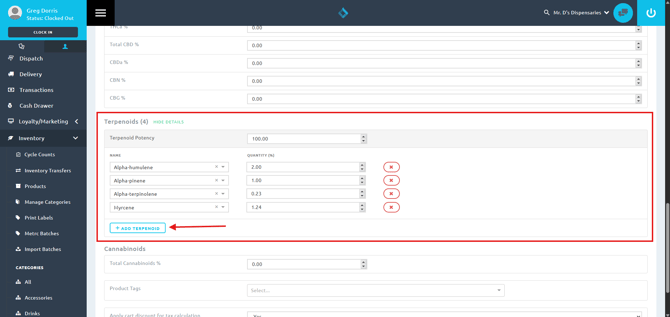 On the product page, click edit and scroll down to the "Terpenoids" section and click "Add Terpenoid" the respective Terpene data. Once all Terpenoids have been entered scroll back to the top of the window, and click save.