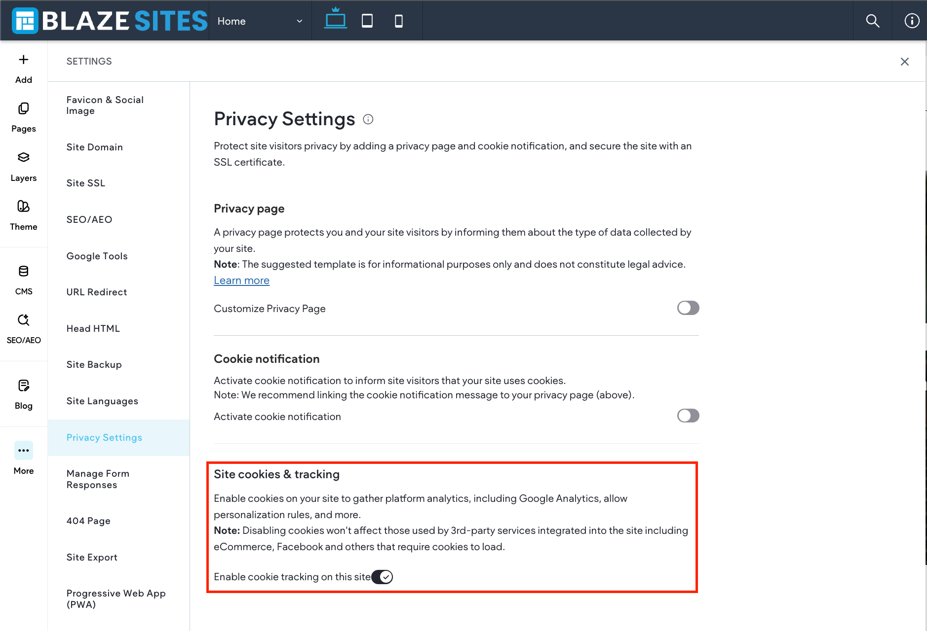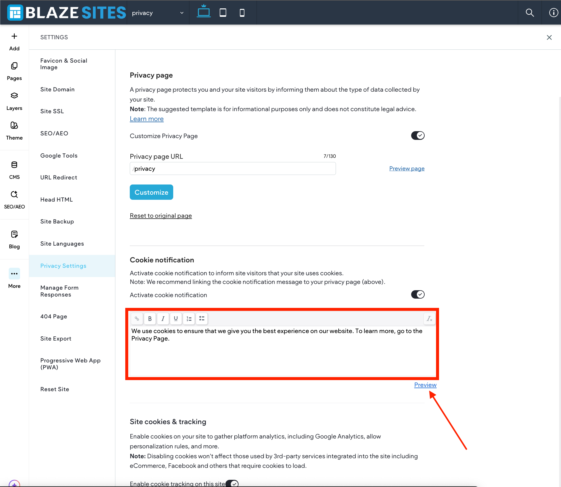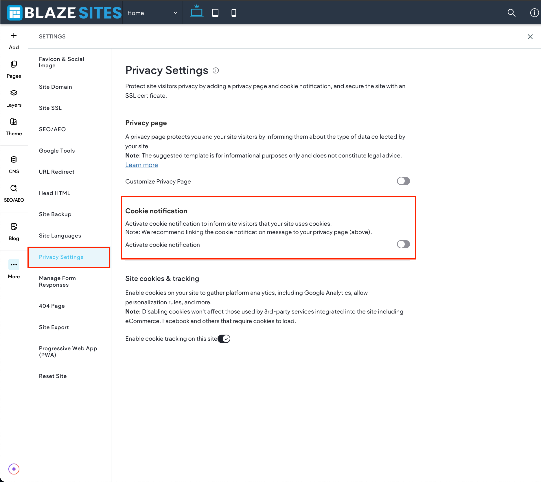 Check the legal requirements in the country of your target audience regarding cookie notifications, the form of the notification, and relevant links to add to the text of the notification. BLAZE is not responsible for configuring cookies or privacy policy pages.