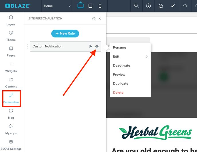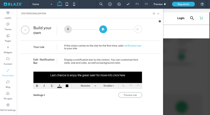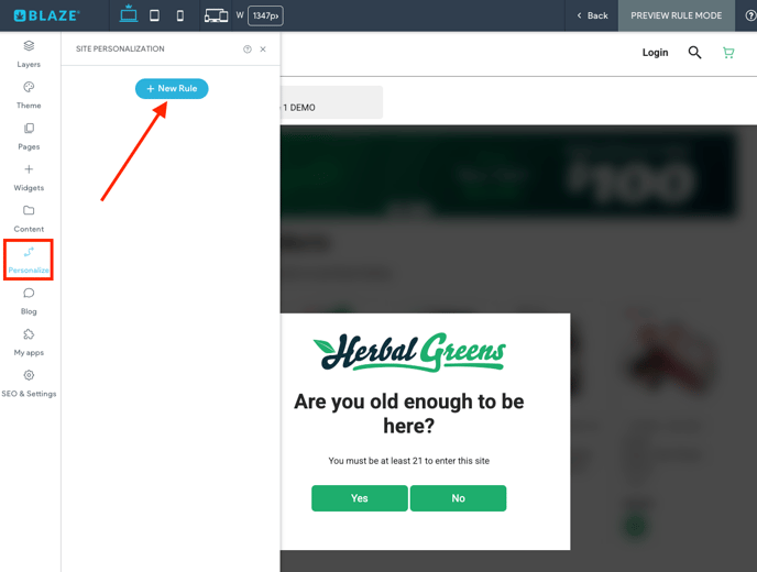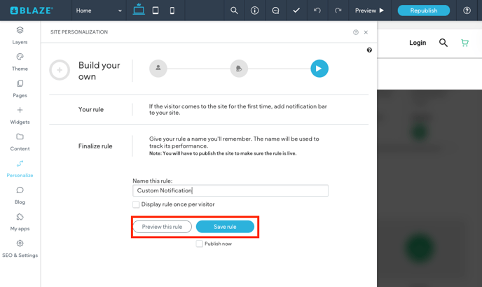 Preview and save your rule. Click Preview to see what your site will look like with the rule activated (click the Back button in the top right of the site to get back to the Rule Editor).