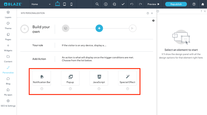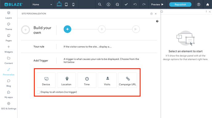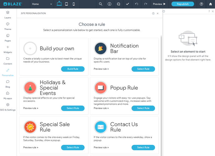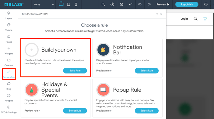 You can build your own personalization rules from scratch. Select and customize the triggers and actions for your personalization rule instead of selecting a pre-made rule.