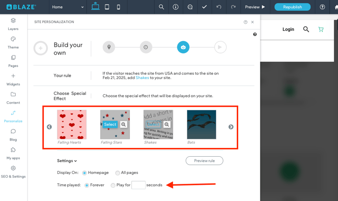 Personalization rule special effects add animations to your site; for example, floating hearts or falling leaves. Use these special effects to celebrate events or add a touch of color.