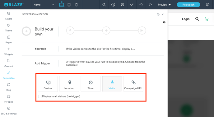 Triggers allow you to define a set of conditions that, when met, automatically execute a specific action on your site. Combine a variety of triggers like time, device-type, or location to create a very customized experience for your site's visitors.