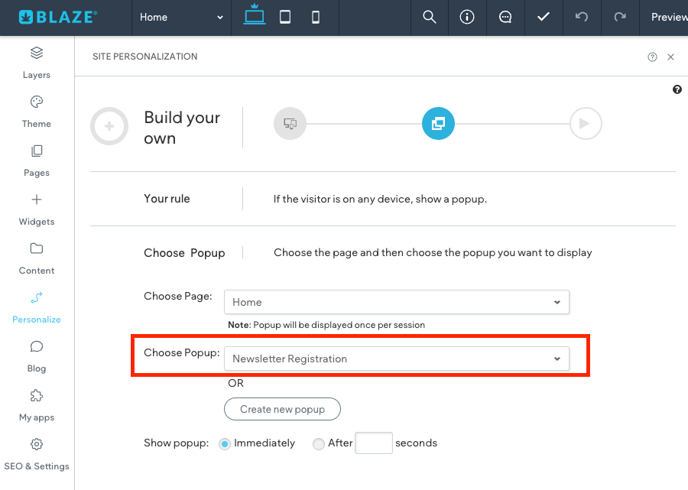 Configure the popup by selecting which page, which popup, and how long to display the popup. Then click Next.