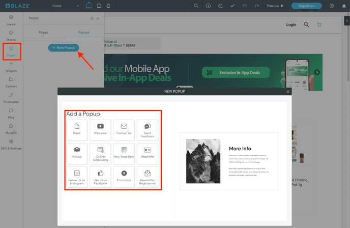 You can create a popup using site personalization or set personalization rules for an existing popup. Personalization rules can include what triggers the popup to appear, how quickly the popup appears on the screen, and more.