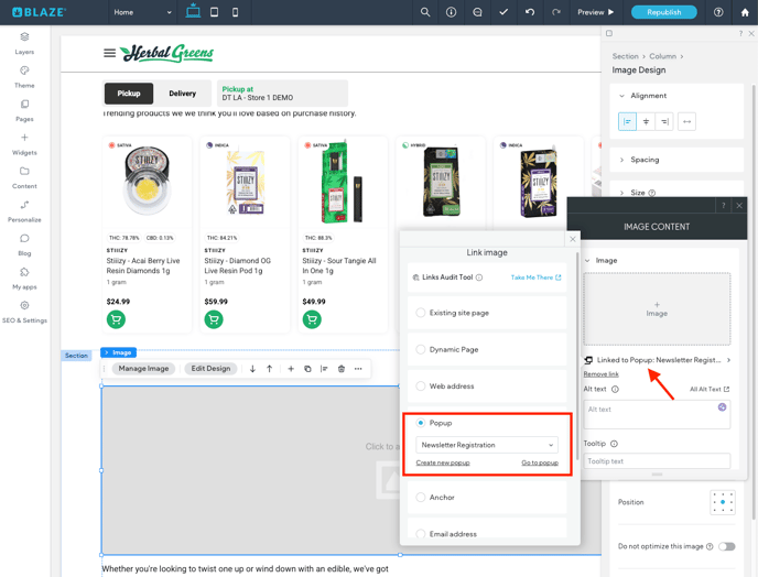 There are several widgets that allow you to link to a popup, such as Photo Gallery image links, text, and buttons.
