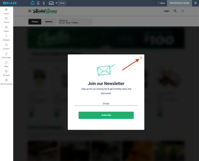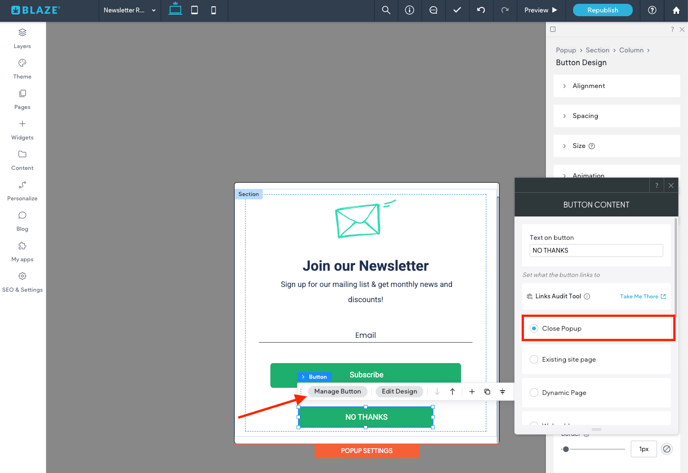 By default, the X button can be clicked to close a popup. You can also add a "Close popup" link to any linkable element in the popup that will close the popup when clicked. For example, you could add the close link to a button that says "No thanks" on a popup that is offering a coupon code. When the website visitor clicks the No thanks button, it will close the popup.