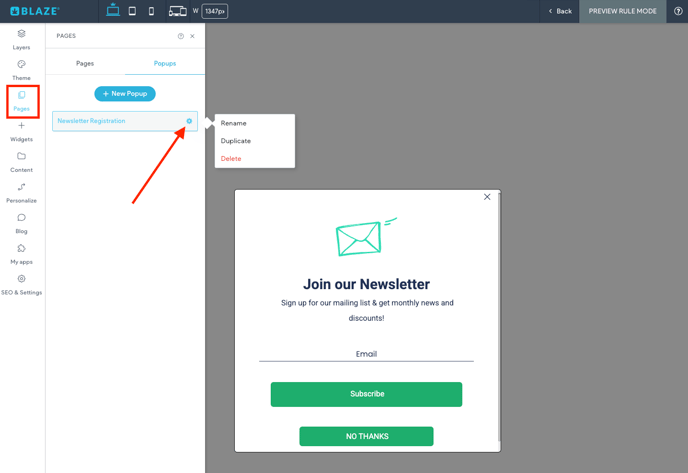 Rename. Rename the popup in the editor. This does not change the page URL.