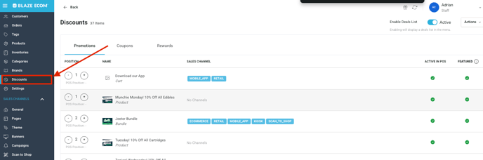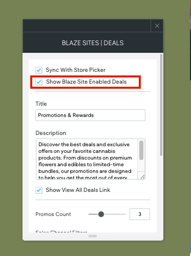 When Show Blaze Site Enabled Deals is enabled in BLAZE Sites on the Deals widget, this will display the corresponding enabled deals in ECOM Mission Control.