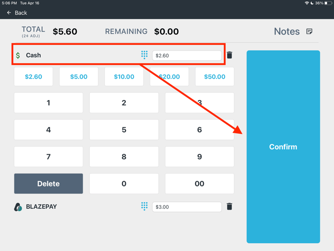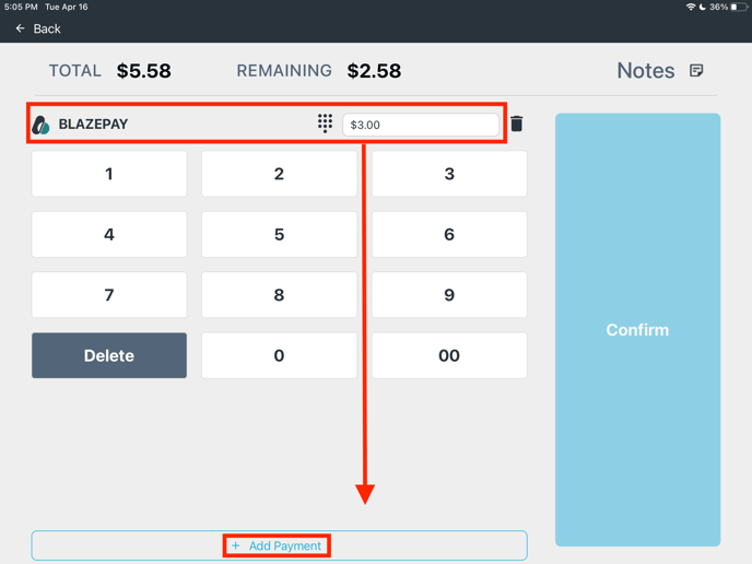 - Select the + Add Payment button and add another form of payment (ex: Cash)
