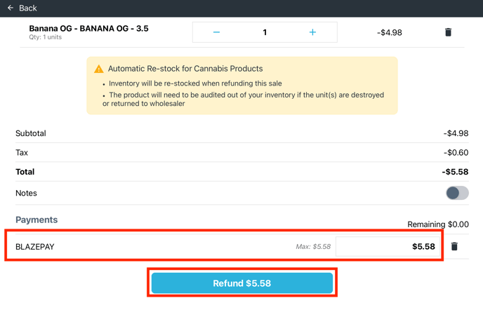 - Enter the amount you wish to refund (e.g., $20.00) on the BLAZEPAY payment option