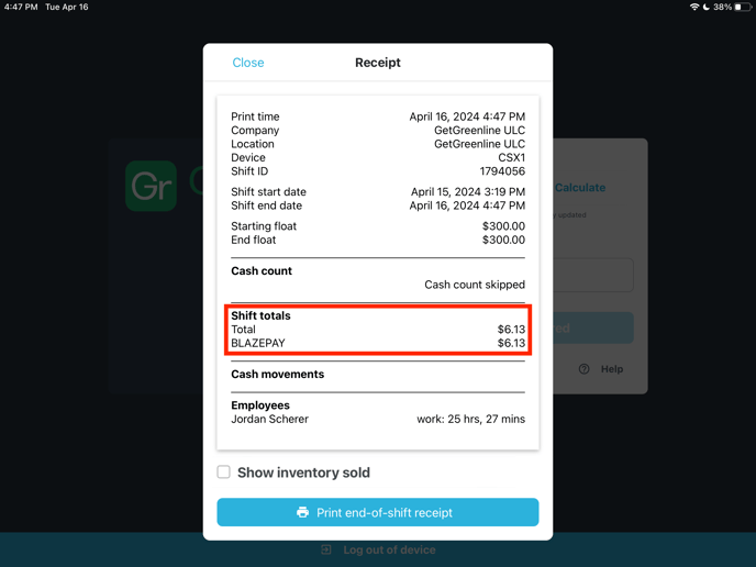 - Once you end your shift, your end of day receipt will show you the totals accepted via the BLAZEPAY payment type