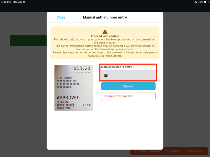 - Enter the "Auth. code" from the receipt that printed on the payment terminal