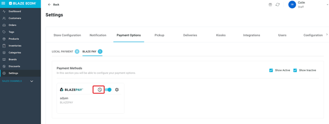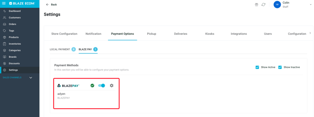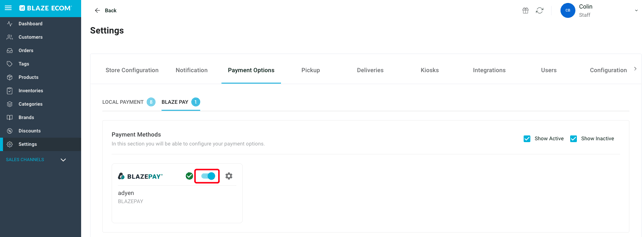 - When fully approved and connected to ECOM, setting the toggle to active will allow BLAZEPAY to be available as a Payment Option in checkout.