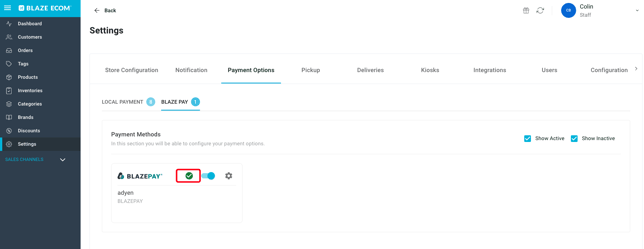 - Once the Greenline POS Dashboard configuration is complete, BLAZEPAY will be available in the BLAZEPAY tab and can be enabled as an available Payment Option in the ECOM menu checkout.