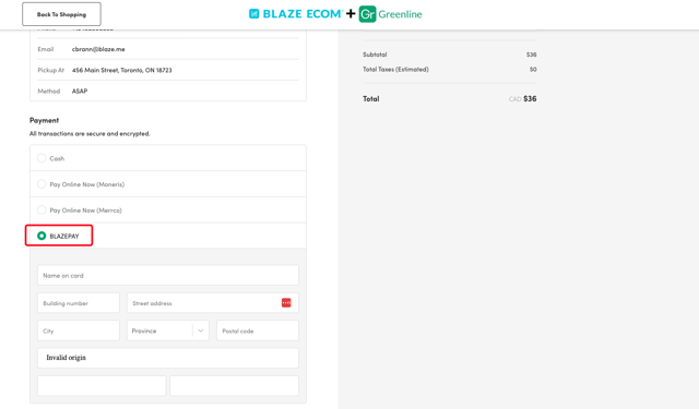 To connect and enable this payment integration on the ECOM menu(s), BLAZEPAY must first be configured in the Greenline POS Dashboard. If this has NOT been completed yet, please refer to this Greenline Knowledge Base article that reviews this process: