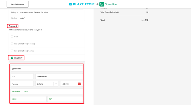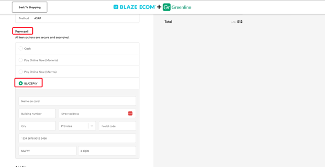 - Once in the ECOM menu checkout, customers will be able to select BLAZEPAY and will need to enter the prompted information to connect their Debit/Credit Card to their ECOM menu account, and place an order