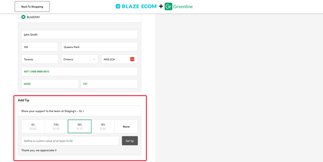 - Customer can add a preset percentage or custom Tip amount before submitting their order, which will be applied to the cart and charged to their card.