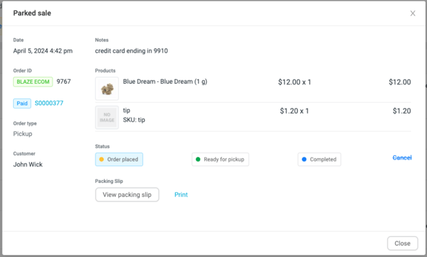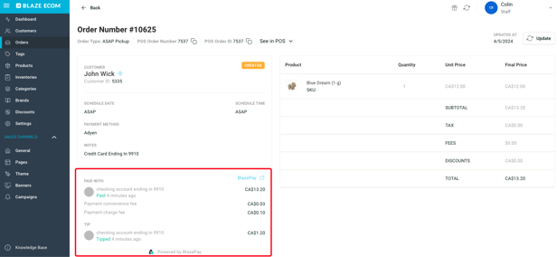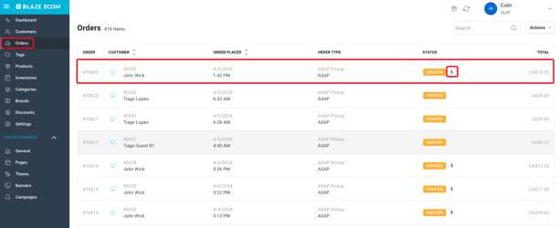 - Orders submitted with the BLAZEPAY payment option will have a $ next to the status, and contain details within the ECOM Mission Control order profile.