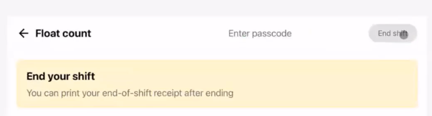 If you choose to count your float later, check off the “Count Later” checkbox and tap on the “Open Drawer” button to take out the cash drawer. Tap on “Next” where you can enter in your passcode and tap on "End Shift".