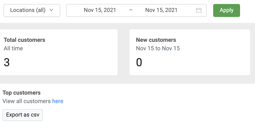 By selecting "View all customers here" you will be provided with a list of the customers and additional information such as how much they have spent. By clicking on the customer's name even more information such as how many visits will be available.