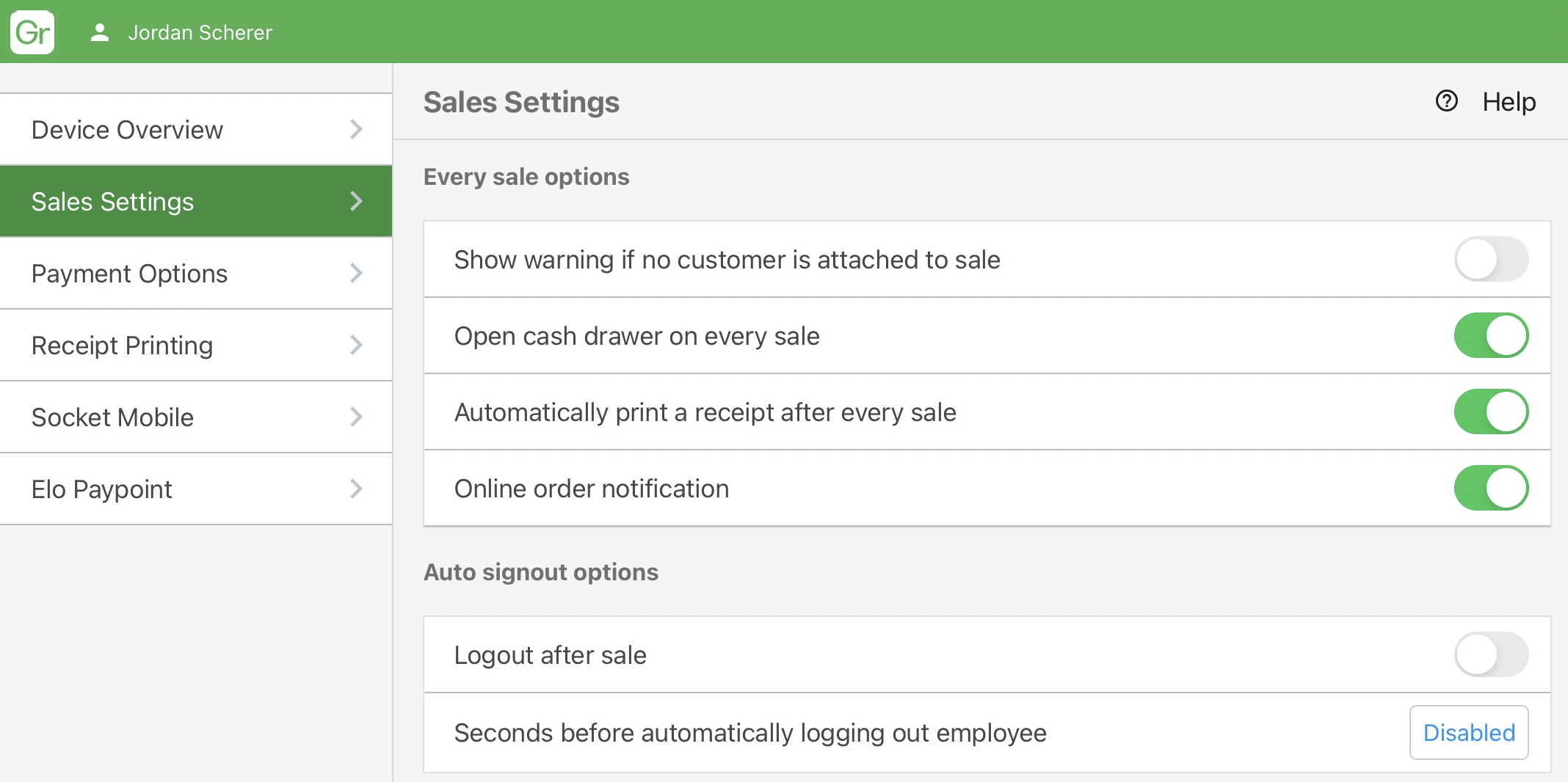 Toggling the "logout after sale" button on will log the employee out of the POS device after each sale is completed. Alternatively, you can also set a timer to initiate an automatic log-off that ranges from 30 seconds to 10 minutes after a sale is completed.