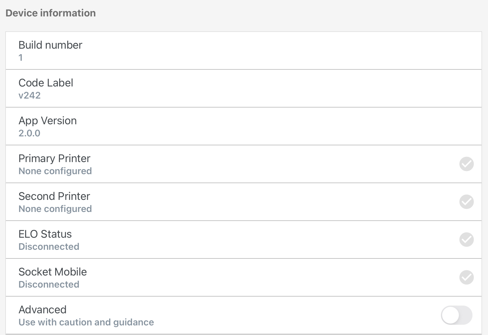 Here you can find any additional device information such as build number, code label, app version, and hardware connection statuses for scanners and printers.