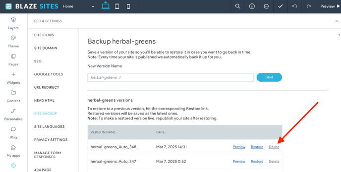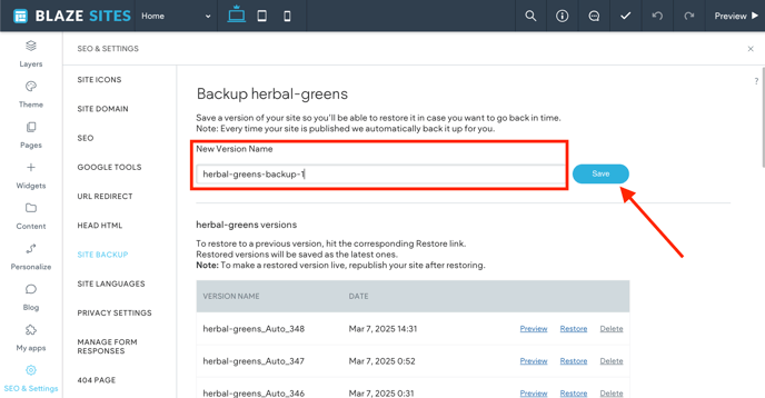 You can save copies of your site called backups. Backups allow you to restore to them at any point in time. While our system automatically creates backups each time a site is published, it is recommended to create manual backups of your site periodically instead of relying on the automated backup system in place.