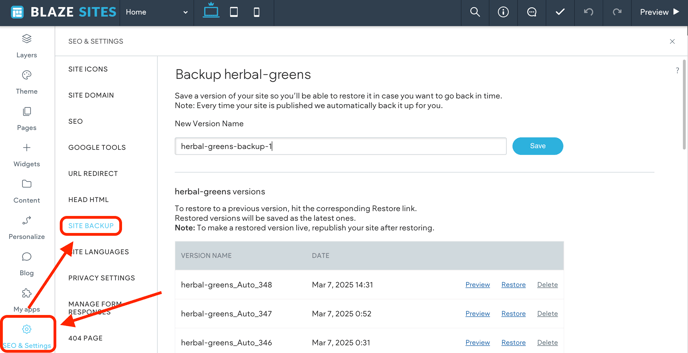 In the left panel, click SEO & Settings, and then click Backup Site.
