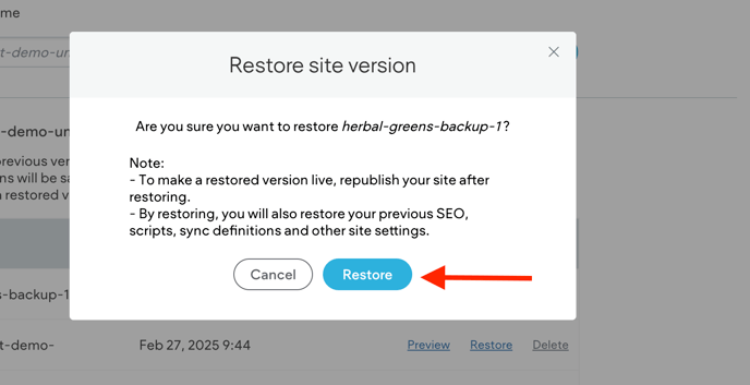 Click the Restore link next to the backup you want to restore.