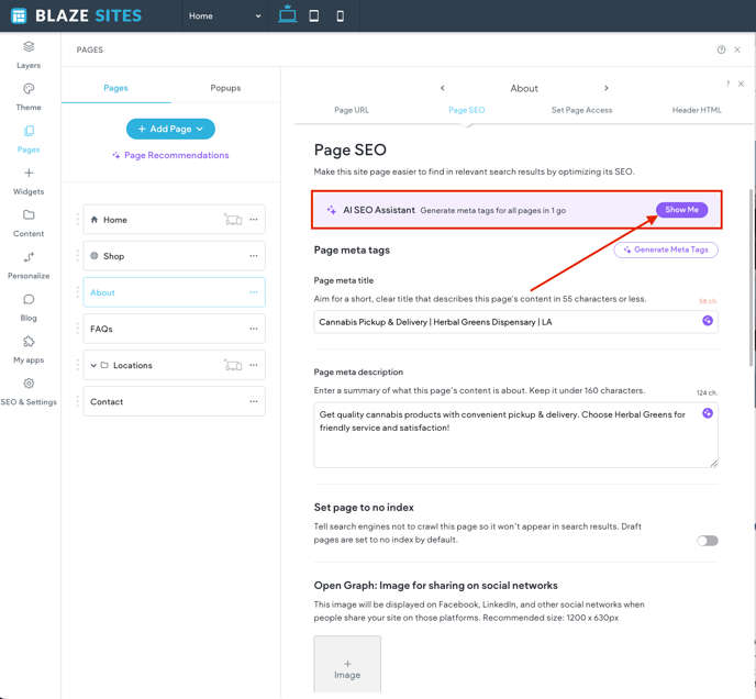 The option to generate SEO with AI can be found in a page’s SEO settings.