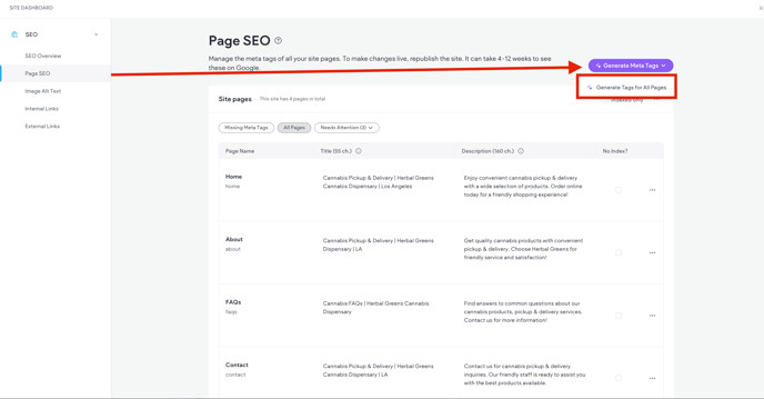 Click Generate SEO tags and select Generate tags for all pages or Generate missing tags only if you have already generated some SEO tags.