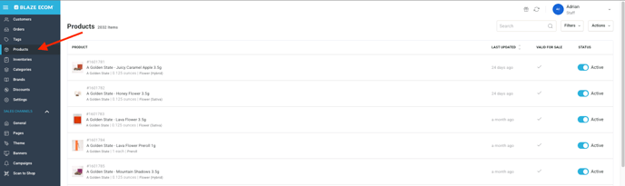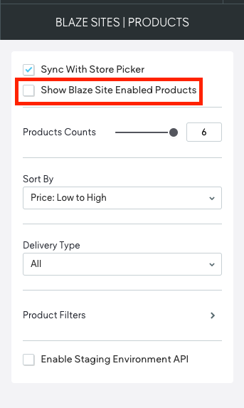 When Show Blaze Site Enabled Products is enabled in BLAZE Sites on the Products widget, this will display the corresponding enabled products in ECOM Mission Control.