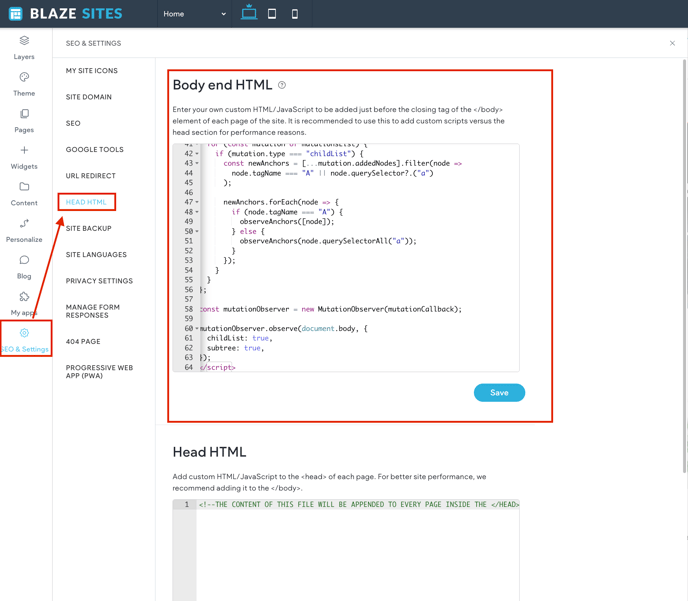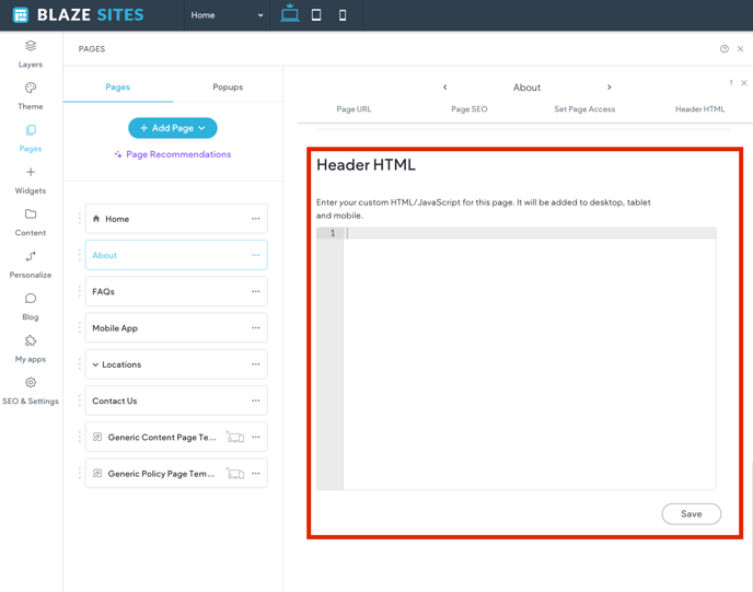 You can also edit the header HTML for that page only. However, it is important to note that consent management apps are not able to prevent code from running prior to consent when the code is placed in the header HTML. This is because BLAZE Sites optimizes the structure and order of how content loads, based on performance best practices on the site. We place scripts and CMP banners lower on the page, in order to improve the performance of primary content. Because of this, it is recommended to place code in the body-end when using a consent management app.