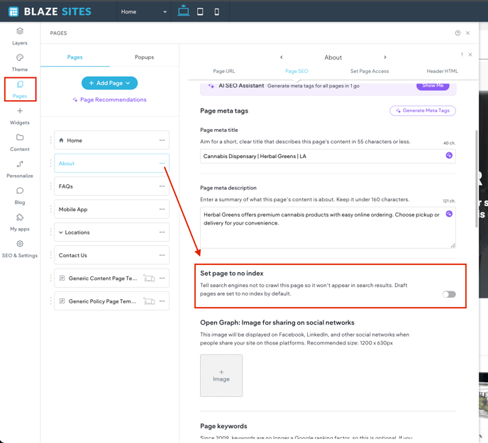 Click the No Index toggle. This instructs search engines to drop or not include this page in their index after they crawl the page.