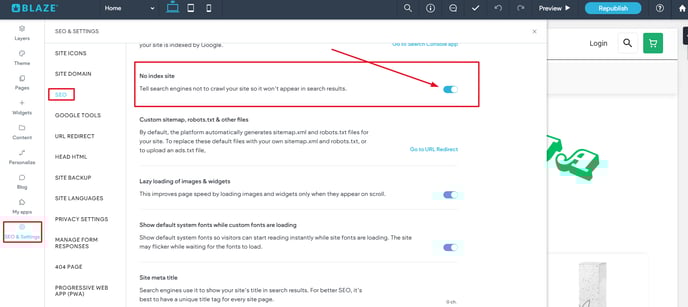 In the side panel, click Settings, and then click SEO. You have the following options: