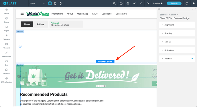Insert to Column: Inserts widget within current column.