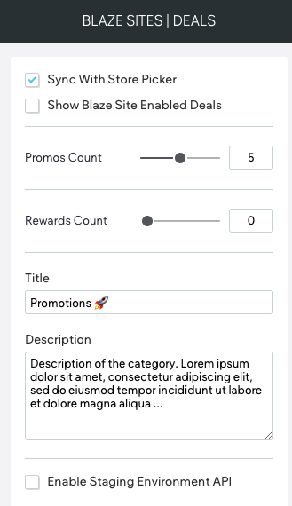 Sync With Store Pickersetting will fetch data based on the current selected store. - Show BLAZE Site Enabled Deals - When checked, display deals that are enabled in BLAZE ECOM Mission Control.