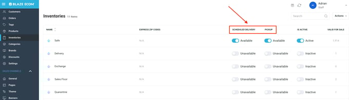 Pickup Only and Scheduled Delivery refers to the toggles in inventory tab in ECOM Mission Control