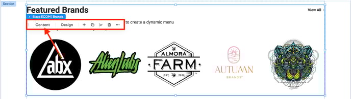 Displays grid of brands per limited or as filtered based on IDs (min: 3 max: 15). Brands allows for the following content to be updated: