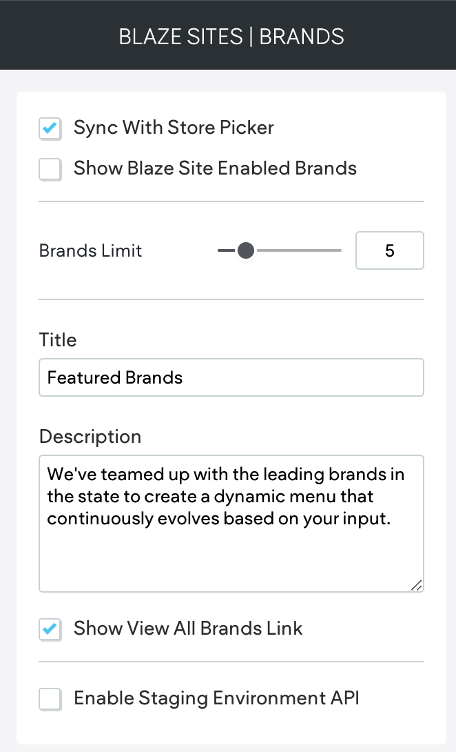 - Show BLAZE Site Enabled Brands - When checked, display brands that are enabled in BLAZE ECOM Mission Control.