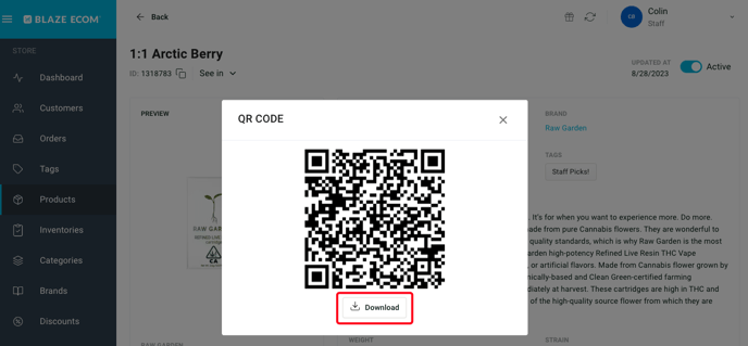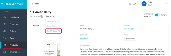 - Once the Scan to Shop has been enabled to your ECOM menu(s), head to the Products tab in Mission Control and click the See in dropdown to download the product's QR code.
