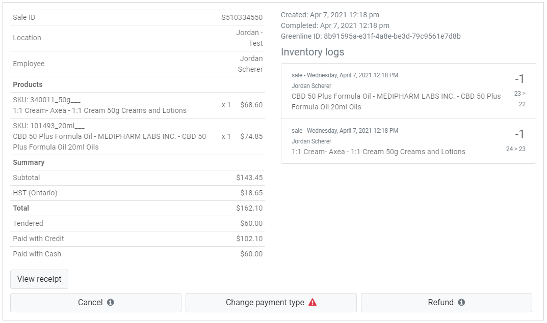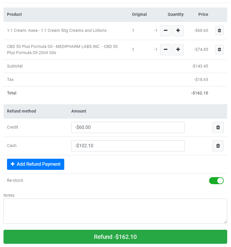 Note: If the "Automatic restock for refunded cannabis products" setting is disabled, the system will not automatically restock refunded cannabis products. It will be left as optional and will need to be manually selected at the time of the refund.