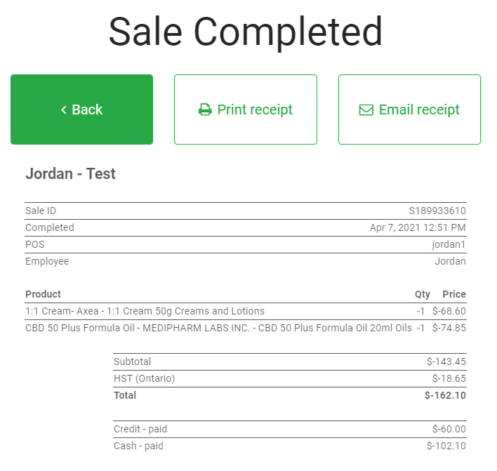When the refund is complete, you can view, print, and email the receipt. Negative amounts will appear on the receipt to reflect the refund and money returned to the customer.