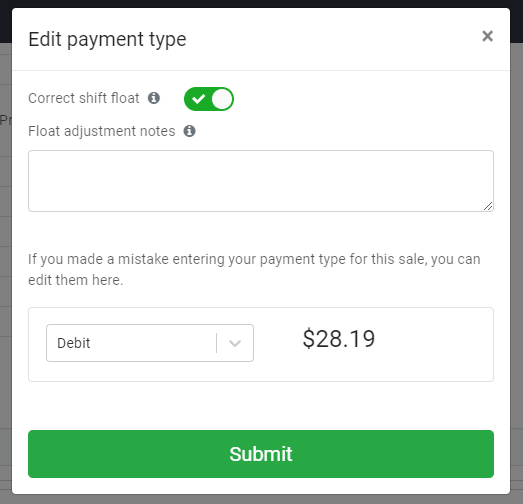 Note if you are changing a payment type from cash to other payment types you will need to correct the float to reflect that this cash movement has occurred so your float will remain balanced.