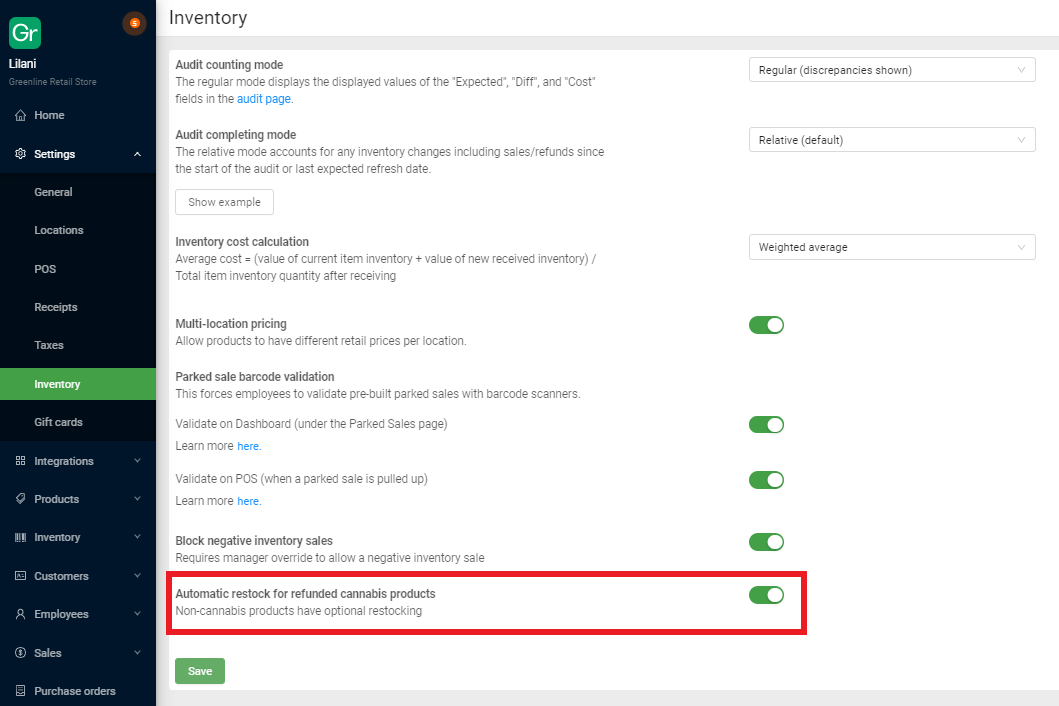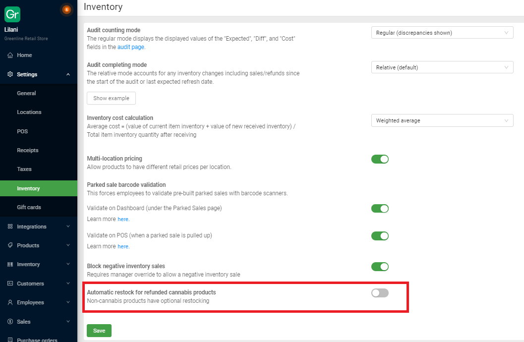 Turn on the "Automatic restock for refunded cannabis products" setting
