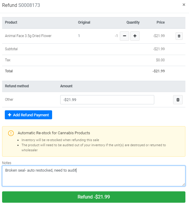 Important: When you are refunding products, BLAZE highly recommends all cannabis refunds be restocked by toggling "restock" on. If any refunded products are required to be destroyed or returned to your wholesaler, you can then audit the units out of inventory and assign the inventory movement with the correct compliance reason.