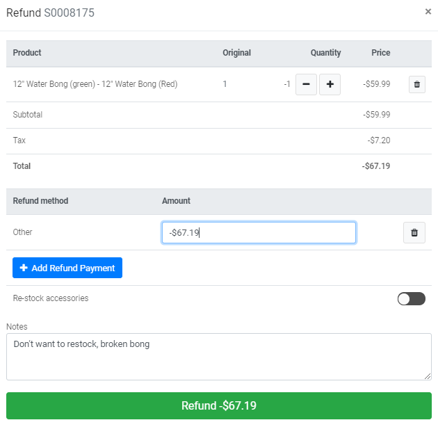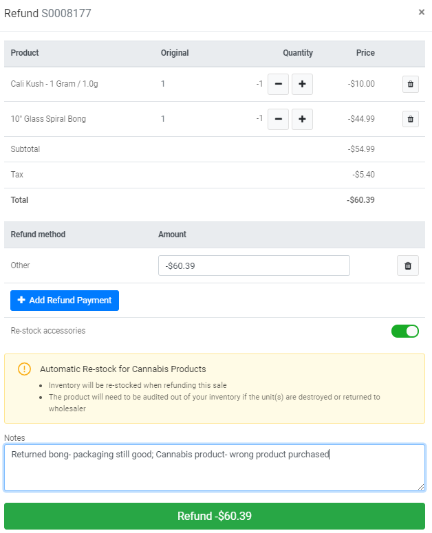 If refund is being done on a sale with cannabis products and accessories, a "restock accessories" toggle will be visible on the POS. Cannabis products will not be impacted and will be automatically restocked.A message will appear to inform the user that the cannabis products have been automatically restocked into your inventory.