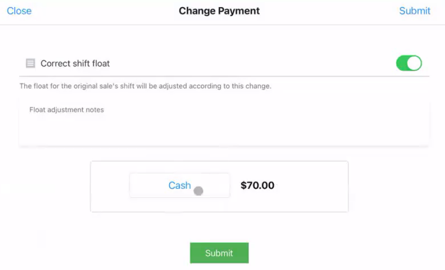 Note if you are changing a payment type from cash to other payment types you will need to correct the float to reflect that this cash movement has occurred so your float will remain balanced.