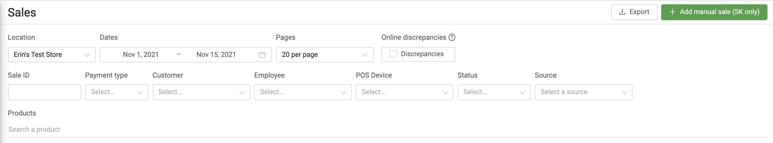 Utilize the filters at the top of the page to get a more granular view of your sales. You are able to filter by location, date ranges, online order discrepancies (from e-commerce), sale ID, payment type, customer, employee, POS device, status, source, and by specific products.