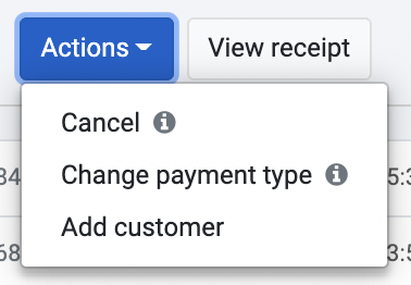 The actions button will allow you to cancel a sale, change the payment type, and add a customer to the sale.